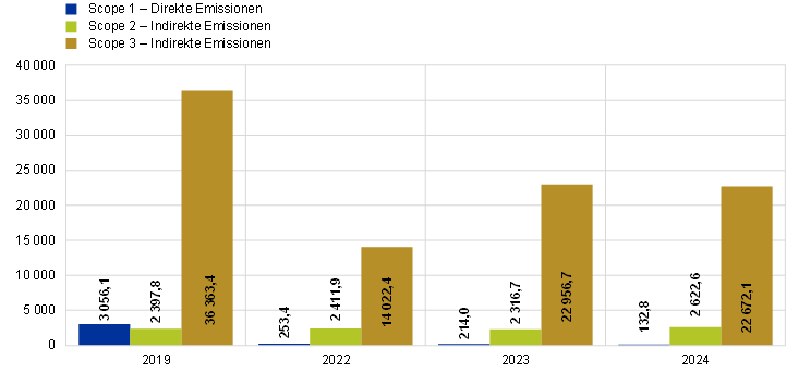 Anmerkung: Die Scope-3-Werte für 2022 wurden von 14 004,3 in 14 022,3 Tonnen CO2e und für 2023 von 22 609,3 in 22 956,6 Tonnen CO2e geändert. Die Grafik zeigt die Ergebnisse für 2019 – das Basisjahr, an dem die langfristigen Ziele der EZB zur Emissionsverringerung gemessen werden – und für die letzten drei Jahre, für die Daten verfügbar sind. Ergebnisse für die Zeit davor sind den früheren Umwelterklärungen zu entnehmen. Als Beitrag zur Emissionssenkung wird seit 2024 ein anderes Kältemittel mit geringerem Erderwärmungspotenzial verwendet.