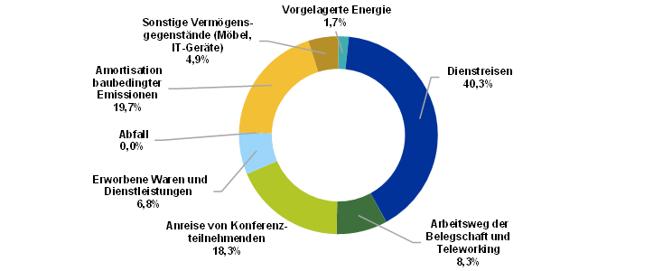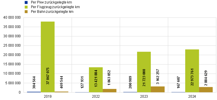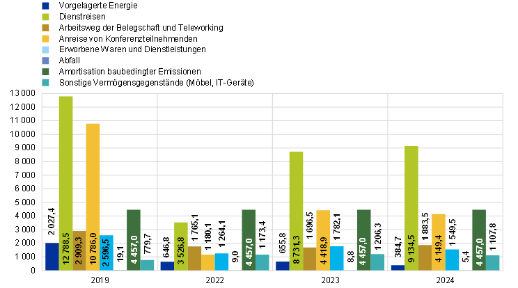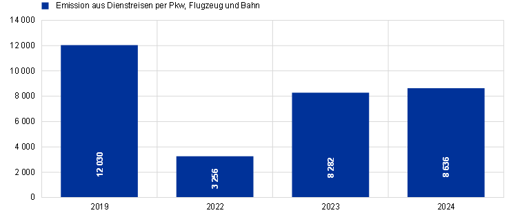 2024 war das zweite Jahr, in dem der Betrieb der EZB wieder komplett ohne pandemiebedingte Einschränkungen ablief. In den Jahren 2020 bis 2022 waren diese Einschränkungen deutlich zu spüren: Dienstreisen waren zu der Zeit nur sehr begrenzt möglich, und auch die Präsenzarbeit in den EZB-Bürogebäuden war eingeschränkt. 2023 wurden die Einschränkungen aufgehoben und die EZB kehrte zum normalen Geschäftsbetrieb zurück. Infolgedessen vergrößerte sich ihr CO2-Fußabdruck wieder, insbesondere wegen des Anstiegs der Emissionen aus Dienstreisen. Diese Emissionsart legte 2024 leicht um 5 % zu, während die Emissionen aus Reisen wegen Konferenzteilnahme um 6 % gegenüber dem Vorjahr abnahmen. Diese beiden Emissionsquellen bleiben wichtige Arbeitsschwerpunkte für die EZB bei den Anstrengungen zur weiteren Verringerung ihrer Klimaauswirkungen (siehe Kapitel 5.2 – Indirekte Emissionen).