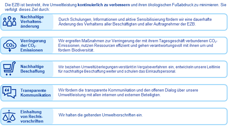 Neben den für sie geltenden umweltrechtlichen Vorschriften hat sich die EZB weitere Verpflichtungen zum Umweltschutz auferlegt. Hierzu gehört die Einhaltung der Leitlinien für nachhaltige Beschaffung und das Erreichen der Ziele des Umweltmanagementprogramms. Darüber hinaus organisiert die EZB jedes Jahr diverse Sensibilisierungsveranstaltungen, um Mitarbeitende für Umweltthemen zu gewinnen.