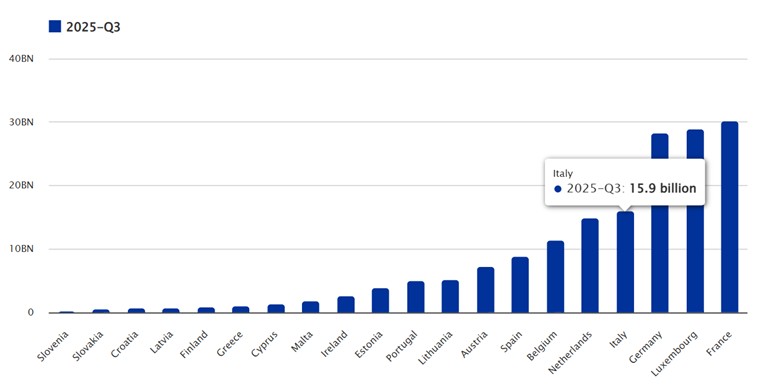 France, Luxembourg, Germany and Italy are the countries in which banks have received the greatest volume of cross-border deposits from other euro area countries. Italy recorded the highest growth in absolute terms over the past five years, with deposits from other countries more than doubling since 2022 (Chart 2). Interestingly, the share of deposits from other euro area countries is highest in Luxembourg (37 percent), Estonia (20 percent), Lithuania (16 percent), Malta (10 percent) and Latvia (6 percent), indicating that smaller countries receive a relatively high level of foreign deposits (Chart 4).