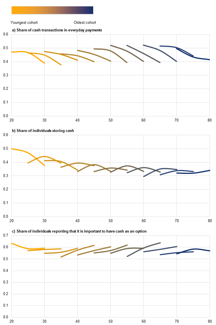 For example, younger people’s high engagement with cash suggests that new generations may continue to find cash useful as they enter the job market, although the effects of an ageing population should also be considered. Younger people notably use cash across its three functions – exhibiting average transactional use, playing a leading role in precautionary cash storage and expressing a strong view that cash is important. This indicates that cash is considered useful during the early stages of financial independence. Simultaneously, it may be the case that the higher volume of cash transactions observed among older generations in ageing euro area populations is a trend that pushes back against the speed of digitalisation. Even if every cohort were to retire with a lower intensity of cash use than its predecessor (period effect), demographic considerations (age effects) may imply a slowing – not accelerating – aggregate decline. All this sheds further doubt on the maximalist position that expects a steep decline in the use of cash in the coming years.