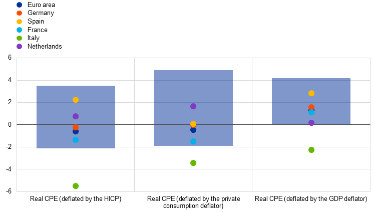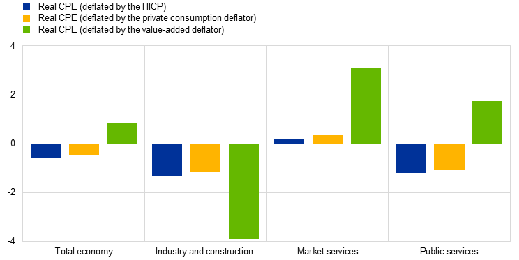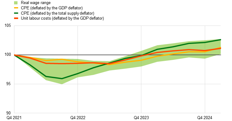 Notes: CPE stands for compensation per employee. Panel a): sectoral value-added deflators are used to calculate real producer wages. For the total economy, the value-added deflator used corresponds to the GDP deflator. Panel b): the shaded area refers to the cross-country inter-quartile range for the respective indicators. The latest observations are for the first quarter of 2025.