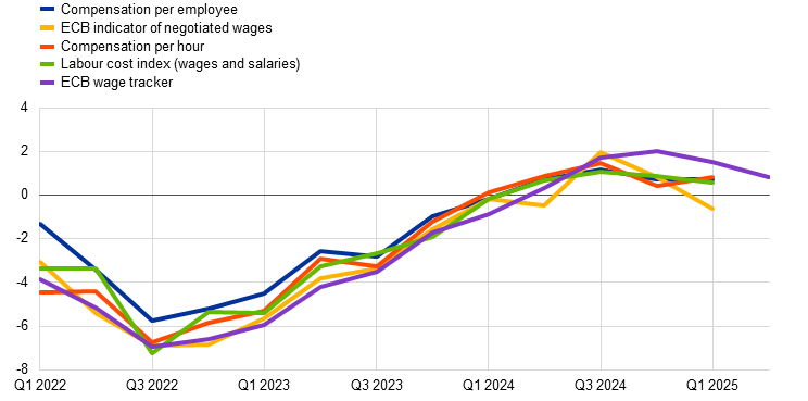 Notes: The chart shows the difference between the annual growth rates of the stated nominal wage indicators less consumers’ 12-month inflation perceptions, as recorded in the CES. For further details on the ECB wage tracker, see Bates et al. (2024). The latest observations are for the second quarter of 2025 for the ECB wage tracker and the first quarter of 2025 for the remaining indicators.