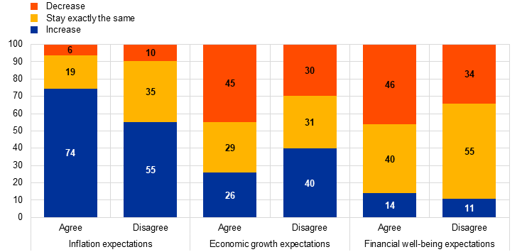 Households expect their own financial well-being to remain largely the same. Most households also believe their financial well-being would stay the same (44%) or decrease a little (32%). This suggests the majority of households do not expect that the defence spending pledged in recent announcements will eventually make them more confident to spend more.[2] It is worth mentioning that the results in Chart B, panel a) do not change significantly if the sample is restricted only to respondents who expect defence spending in their country to increase.[3] That being said, the quantitative impact of different defence spending beliefs on expectations for inflation and growth remains limited so far.