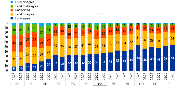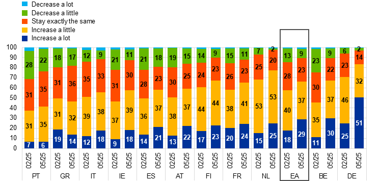 Fiscal policies in the euro area are increasingly shaped by a focus on defence spending in response to heightened geopolitical tensions. The February 2025 Munich Security Conference, the launch of the European Commission’s Preparedness Union Strategy in March and the conclusions of the June 2025 NATO Summit all underscored EU governments’ commitment to increasing defence spending.[1] This box uses data from the ECB Consumer Expectations Survey (CES) rounds conducted in February and May 2025 to assess euro area household expectations regarding defence spending, in terms of both its economic impact in their respective countries and its implications for their personal financial well-being.
