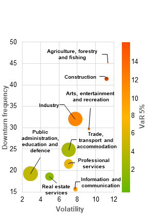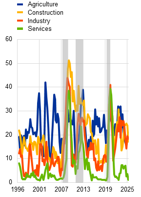 Rolling recessions may lead to a build-up of risks in individual sectors, creating pockets of vulnerability. Evidence from recent macro-financial shocks suggests that sectoral vulnerabilities can materialise in a staggered manner without spilling over to the broader economy until they reach critical mass or become synchronised (Chart A, panel b). While aggregate GDP and employment data may appear stable, firms in sectors like agriculture, construction or energy and interest rate-sensitive industries can face margin pressures, cost shocks and financing constraints owing to external factors such as commodity price changes, supply chain disruptions and monetary policy tightening. Some sectors are structurally more vulnerable, with high levels of volatility and more frequent downturns indicating greater sensitivity to shocks and lower adaptability (Chart A, panel c). For example, construction and agriculture are generally more sensitive to weather conditions and climate change, while sectors such as industry tend to be more affected by financing conditions, energy prices and trade dynamics.