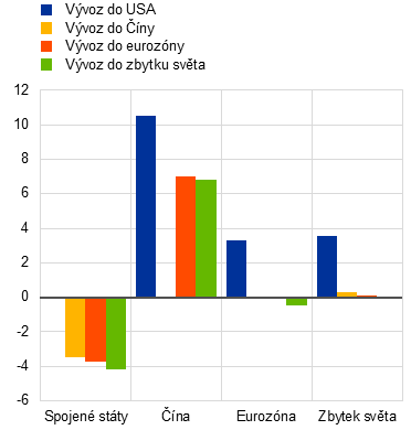 Poznámky: Graf ukazuje změny dvoustranného obchodu ve čtvrtém čtvrtletí 2027 (nevážené). Čína má částečně řízený směnný kurz. Pro zbytek světa je výpočet prováděn za pomoci prostého průměru odchylek vývozu od základní projekce pro všechny regiony v globálním modelu ECB s výjimkou Spojených států, Číny a eurozóny.