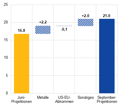 Im Vergleich zu den Projektionen vom Juni 2025 sind die effektiven Zollsätze für Importe des Euroraums und aller seiner Handelspartner nach dem Handelsabkommen zwischen den USA und der EU sowie weiteren Bekanntmachungen höher. Die Projektionen berücksichtigen die bei Redaktionsschluss (28. August) geltenden Zollsätze, Unterbrechungen und Ausnahmebestimmungen und gehen davon aus, dass diese über den gesamten Projektionszeitraum hinweg auf demselben Niveau bleiben werden.