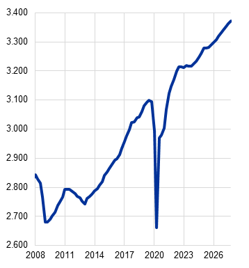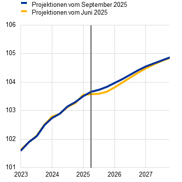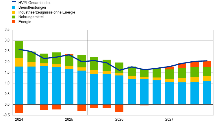 Die Inflationsaussichten stehen mit einer Stabilisierung der Inflation in der Nähe des mittelfristigen Ziels von 2 % im Einklang. Die am Harmonisierten Verbraucherpreisindex (HVPI) gemessene Gesamtinflation dürfte den Projektionen zufolge im weiteren Jahresverlauf 2025 bei rund 2 % verharren, bevor sie 2026 auf 1,7 % zurückgeht und 2027 wieder auf 1,9 % ansteigt. Der Rückgang im Jahr 2026 spiegelt eine weitere allmähliche Abschwächung der Nicht-Energie-Komponenten wider, während die Energiepreise den Erwartungen zufolge volatil bleiben werden. Sie dürften über den Projektionszeitraum hinweg jedoch ansteigen, unter anderem wegen der Einführung des EU-Emissionshandelssystems 2 (EU-EHS 2) im Jahr 2027. Die Teuerung bei Nahrungsmitteln dürfte zunächst erhöht bleiben, da sich die vergangenen Anstiege der internationalen Nahrungsmittelrohstoffpreise mit Verzögerung auswirken. In den Jahren 2026 und 2027 dürfte die betreffenden Raten jedoch auf Werte von etwas über 2 % zurückgehen. Die HVPI-Inflation ohne Energie und Nahrungsmittel (HVPIX) dürfte sinken. Dies ist auf nachlassenden Lohndruck und eine rückläufige Teuerung bei Dienstleistungen zurückzuführen. Ein weiterer Grund ist die Aufwertung des Euro, die auf die Preissetzungskette durchwirkt und die Teuerung bei Waren dämpft. Das geringere Lohnwachstum – zurückliegende Reallohnverluste wurden wettgemacht – dürfte zusammen mit einer Erholung des Produktivitätswachstums zu einem deutlich langsameren Anstieg der Lohnstückkosten führen. Im Vergleich zu den Projektionen vom Juni 2025 wurden die Aussichten für die HVPI-Gesamtinflation für 2025 und 2026 um jeweils 0,1 Prozentpunkte nach oben revidiert. Gründe hierfür sind höhere tatsächliche und angenommene Werte für die Energierohstoffpreise sowie verzögerte Auswirkungen der höheren internationalen Nahrungsmittelrohstoffpreise, die die Aufwertung des Euro mehr als ausglichen. Für das Jahr 2027 werden die verzögerten Auswirkungen der Euro-Aufwertung als vorherrschend betrachtet, was zu einer Abwärtskorrektur um 0,1 Prozentpunkte führt.