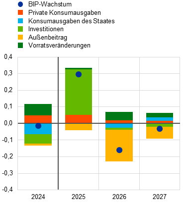 Das Wachstum des realen BIP dürfte weiterhin vom privaten Konsum getragen werden. Hinsichtlich der Verwendung (siehe Abbildung 2, Grafik a) wird projiziert, dass die privaten Konsumausgaben über den gesamten Projektionszeitraum hinweg kräftig wachsen und den größten Beitrag zum Wachstum des realen BIP leisten werden. Darüber hinaus dürften die staatlichen Konsumausgaben und Gesamtinvestitionen von 2025 bis 2027 jedes Jahr steigen. Dabei sollten die privaten Investitionen den erwarteten starken Klippeneffekt bei den öffentlichen Investitionen im Jahr 2027 ausgleichen, der sich aus dem Auslaufen der NGEU-Zuschüsse ergibt. Im Gegensatz dazu werden die Nettoexporte den Projektionen zufolge in den Jahren 2025 und 2026 einen negativen Beitrag zum Wachstum des realen BIP leisten. Dabei übersteigt der Beitrag der Importe (-1,2 Prozentpunkte bzw. -0,9 Prozentpunkte) den Beitrag der Exporte (0,6 Prozentpunkte bzw. 0,5 Prozentpunkte). Dies wird jedoch durch einen positiven Beitrag der Vorratsveränderungen im Jahr 2025 teilweise ausgeglichen (siehe Abbildung 2, Grafik b). Die sehr volatile Entwicklung der Vorratsveränderungen im Jahresverlauf 2025 hängt mit dem Lageraufbau und dem Lagerabbau im Zusammenhang mit Vorzieheffekten und ihrem Nachlassen zusammen.