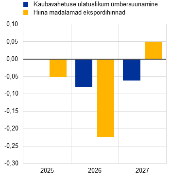 Euroala konkurentide ekspordihindade kasvumäär jääb prognoosi kohaselt pikaajalisest keskmisest aeglasemaks, tingituna püsivalt madalatest ekspordihindadest Hiinas. Euroala konkurentide ekspordihinnad (riikide vääringutes) peaksid tõusma 2025. aastal 1,6%, 2026. aastal 2,1% ja 2027. aastal 2,3%. See tõus on pikaajalisest keskmisest (2,6% aastatel 2000–2019) väiksem, sest Hiina ekspordihindade inflatsioon jääb prognoosi kohaselt kuni 2026. aasta lõpuni negatiivseks. 2025. aasta juuni ettevaatega võrreldes kajastab allapoole korrigeerimine 2025. ja 2026. aastaks Hiina madalamate ekspordihindade mõju, mis on osaliselt tingitud tootjahindade püsivast deflatsioonist ja madalamatest toiduainehindadest, mis korvavad täielikult veidi kõrgemate naftahinna eelduste mõju.