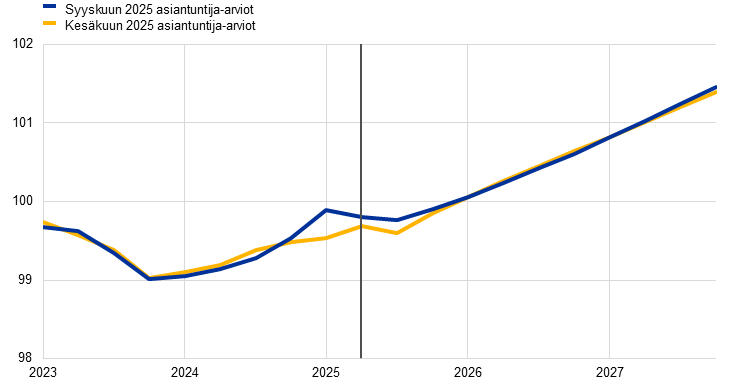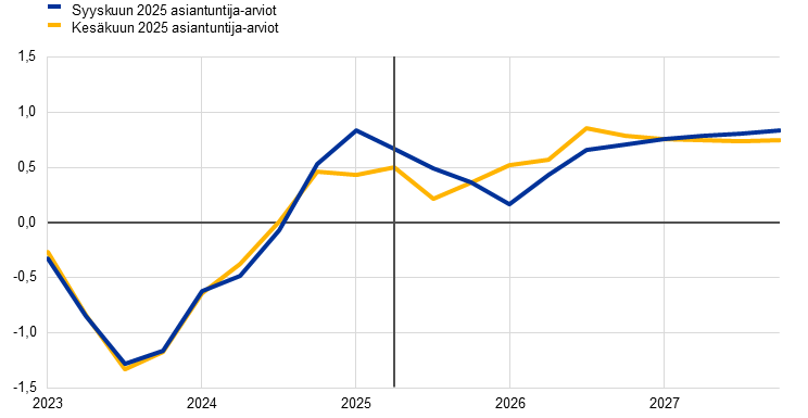 EKP:n asiantuntijoiden syyskuun 2025 arviot asettuvat muiden laitosten ennusteiden vaihteluvälille vuonna 2025 mutta sijoittuu sekä kasvun että inflaation osalta sen alapäähän tai alapuolelle vuosina 2026 ja 2027. Asiantuntijoiden laatima kasvuarvio vuodelle 2025 asettuu muiden julkisten laitosten ja yksityisten sektorin ennusteiden vaihteluvälin yläpäähän, mutta kasvuarviot vuosille 2026 ja 2027 ovat vaihteluvälin alapuolella. EKP:n asiantuntijoiden vuoden 2025 inflaatioarvio on muiden ennusteiden mukainen. Vuoden 2026 osalta se sijoittuu vaihteluvälin alapäähän ja vuoden 2027 osalta muiden saatavilla olevien ennusteiden alapuolelle. Energia- ja elintarvikehinnoista puhdistettua YKHI-inflaatiota koskevat EKP:n asiantuntijoiden arviot vuosille 2025 ja 2026 ovat muiden saatavilla olevan ennusteiden vaihteluvälillä ja vuoden 2027 osalta niiden alapuolella.