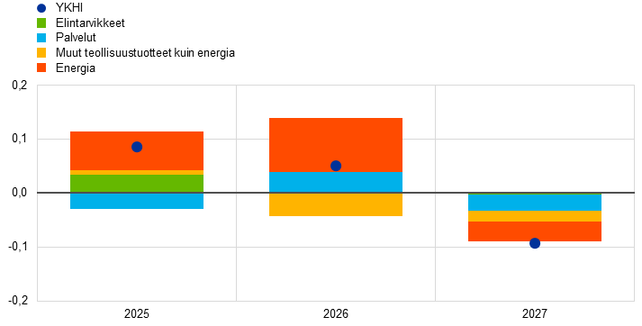 Inflaationäkymät viittaavat siihen, että inflaatio vakautuu 2 prosentin tavoitteen tuntumaan. Yhdenmukaistetulla kuluttajahintaindeksillä (YKHI) mitatun kokonaisinflaation arvioidaan pysyvän noin 2 prosentissa vuoden 2025 loppupuolella, hidastuvan 1,7 prosenttiin vuonna 2026 ja nopeutuvan sitten 1,9 prosenttiin vuonna 2027. Inflaation hidastuminen vuonna 2026 johtuu hintojen vähittäisestä laskusta muissa kuin energiaerässä. Energian hintainflaation odotetaan sen sijaan vaihtelevan edelleen voimakkaasti mutta nopeutuvan arviointijakson kuluessa osin vuonna 2027 käynnistyvän EU:n ETS2-päästökauppajärjestelmän vuoksi. Elintarvikkeiden hintainflaation odotetaan pysyvän aluksi nopeana, kun elintarvikeraaka-aineiden maailmanmarkkinahintojen aiempi nousu välittyy hinnoitteluketjuun viipeellä. Vuosina 2026 ja 2027 elintarvikeinflaation odotetaan kuitenkin maltillistuvan ja asettuvan hieman 2 prosentin yläpuolelle. Energia- ja elintarvikehinnoista puhdistetun YKHI-inflaation odotetaan hidastuvan, kun palkkapaineet heikkenevät ja palvelujen hintainflaatio maltillistuu ja kun euron vahvistuminen välittyy hinnoitteluketjuun hilliten tavaroiden hintainflaatiota. Palkkojen kasvu heikkenee reaalipalkkojen aiemmasta laskusta johtuvien ansionmenetysten kattamisen myötä, ja tuottavuuden kasvu elpyy. Näiden kahden tekijän odotetaan yhdessä hidastavan yksikkötyökustannusten kasvua merkittävästi. Kokonaisinflaatio vuosina 2025 ja 2026 on nyt arvioitu 0,1 prosenttiyksikköä nopeammaksi kuin kesäkuun 2025 asiantuntija-arvioissa, sillä energiaraaka-aineiden hinnat ja hintaoletukset ovat nousseet. Lisäksi hinnoitteluketjuun viipeellä välittyvä elintarvikeraaka-aineiden maailmanmarkkinahintojen nousu vaikuttaa inflaatioon voimakkaammin kuin euron vahvistuminen. Vuonna 2027 vallitsevina ovat euron vahvistumisen viivästyneet vaikutukset, joten inflaatioarviota on tarkistettu 0,1 prosenttiyksikköä alaspäin.