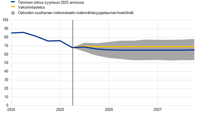 Huom. Määrällisten oletusten tarkistukset on ilmaistu prosentteina, kasvuvauhtia koskevien oletusten tarkistukset prosenttiyksikköinä ja korko- ja tuotto-oletukset vuotuisina prosentteina. Kasvuvauhtia ja korkoja koskevien tarkistusten laskennassa on käytetty yhden desimaalin tarkkuudella pyöristettyjä lukuja, kun taas prosenttimuutoksina ilmoitetut tarkistukset on laskettu pyöristämättömien lukujen perusteella. Euroalueen korkoja ja raaka-aineiden hintoja koskevat tekniset oletukset perustuvat markkinaodotuksiin aineiston koontipäivänä 15.8.2025. Öljyn hintaoletukset perustuvat Brent-raakaöljyn spot- ja futuurihintoihin. Kaasun hintaoletukset perustuvat Dutch TTF ‑kaasun spot- ja futuurihintoihin. Sähkön hintaoletukset perustuvat tukkusähkön keskimääräiseen spot- ja futuurihintaan viidessä suurimmassa euroalueen maassa. EU:n ETS1-päästökauppajärjestelmän päästöoikeuksien ”synteettinen” futuurihinta johdetaan Euroopan energiapörssin (European Energy Exchange, EEX) kahden lähimmän päästöoikeusfutuurin kuukauden lopun lineaarisesti interpoloidusta arvosta. Päästöoikeusfutuurien kuukausihintojen keskiarvosta lasketaan sitten niitä vastaava vuosikeskiarvo. Koska ETS2-päästökauppajärjestelmän päästöoikeuksilla ei ole vielä käyty kauppaa, hintaoletukset asetettiin sen kynnysarvon mukaiseksi, jonka ylittyessä vapautetaan lisää päästöoikeuksia. Kynnysarvo perustuu vuoden 2027 hintaoletuksiin (lisätietoja on eurojärjestelmän asiantuntijoiden joulukuun 2024 arvioiden kehikossa ”Arvioita ilmastonmuutokseen liittyvien siirtymätoimien vaikutuksesta talouskasvuun ja inflaatioon”). Raaka-aineiden hintojen kehitys johdetaan aineiston koontipäivää edeltävien kymmenen viimeisen arkipäivän futuurimarkkinahintojen kehityksestä. Kahdenvälisten valuuttakurssien oletetaan pysyvän arviointijaksolla ennallaan sillä tasolla, jolla ne keskimäärin olivat aineiston koontipäivää edeltävinä kymmenenä viimeisenä arkipäivänä. Euroalueen valtioiden 10 vuoden joukkolainojen nimellistuottoja koskevat oletukset perustuvat maiden 10 vuoden joukkolainojen tuottojen keskiarvoon, jossa painoina käytetään maiden vuotuisia BKT-lukuja. Mikäli tarvittavat tiedot ovat saatavilla, valtion 10 vuoden joukkolainojen maakohtaiset nimellistuotot määritellään 10 vuoden viitelainojen tuotoiksi, joita jatketaan käyttäen vastaavista maakohtaisista tuottokäyristä johdettuja nimellishintaisia termiinituottovaatimuksia. Muiden valtioiden 10 vuoden joukkolainojen maakohtaiset tuotot määritellään 10 vuoden viitelainojen tuotoksi, jota jatketaan käyttäen (aineiston koontipäivänä havaittua) vakioitua tuottoeroa euroalueen riskittömiä pitkiä korkoja koskevaan tekniseen oletukseen nähden.