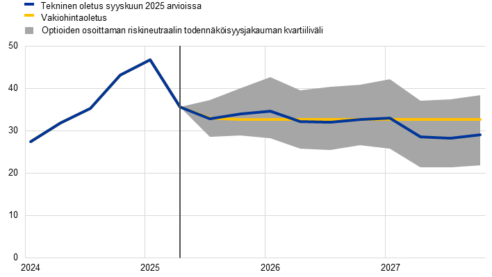 Tämänkertaisissa teknisissä oletuksissa öljyn hintojen oletetaan olevan korkeammat, kaasun ja raaka-aineiden hintojen alemmat ja euron kurssin vahvempi kuin kesäkuun 2025 asiantuntija-arvioissa. Rahoitusmarkkinoita koskevat oletukset ovat sen sijaan pysyneet suurin piirtein ennallaan. Öljyn hintaoletuksia on tarkistettu keskimäärin noin 3 % ylöspäin vuosille 2025–2027. Sähkön hintaoletuksia on tarkistettu noin 2 % ylöspäin, kun taas kaasun tukkuhintoja koskevia oletuksia on tarkistettu jonkin verran alaspäin. Myös oletusta EU:n nykyisen päästökauppajärjestelmän (ETS1) mukaisten päästöoikeuksien hinnasta on tarkistettu jonkin verran alaspäin. EU:n uuden päästökauppajärjestelmän (ETS2) hintaa koskeva oletus on sen sijaan pidetty ennallaan. Muiden raaka-aineiden kuin energian hintoja on tarkistettu hieman alaspäin. Kesäkuun asiantuntija-arvioiden jälkeen euro on vahvistunut 3,3 % Yhdysvaltain dollariin nähden ja 2,3 % nimellisellä efektiivisellä valuuttakurssilla mitattuna. Korkoja koskevat oletukset ovat pysyneet suurin piirtein ennallaan.