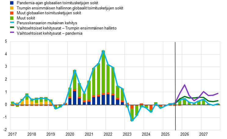 Kauppavirtojen kiihtyvä muutos, jossa Yhdysvaltoihin suuntautuneen tuonnin lähtömaat entistä useammin korvautuvat, vaikuttaa Yhdysvaltain talouteen merkittävästi mutta euroalueeseen vain vähän (ks. kuvion 17 kohta a).[14] ECB Global ‑malliin perustuvat simulaatiot osoittavat, että tämä muutos aiheuttaisi Yhdysvalloissa maan kuluttaja- ja tuottajahintoihin välittyvän tuontihintojen nousun, joten Yhdysvaltain inflaatio voisi olla perusskenaarioon nähden enimmillään 0,2 prosenttiyksikköä nopeampi vuonna 2026. Yhdysvaltain korkotaso nousisi, mikä vaikuttaisi negatiivisesti kulutukseen ja investointeihin, joten Yhdysvaltain BKT:n kasvu olisi perusskenaarioon verrattuna 0,2 prosenttiyksikköä pienempi vuonna 2026. Vaikutus Kiinaan olisi vähäisempi. Euroalueen osalta ECB BASE ‑malliin perustuvat simulaatiot viittaavat siihen, että Kiinaan ja muihin maihin suuntautuvan viennin supistuminen tasoittaisi Yhdysvaltoihin suuntautuvan viennin kasvua. Niinpä euroalueen BKT:n kasvu ja YKHI-inflaatio olisivat noin 0,05 prosenttiyksikköä hitaampia vuosina 2026 ja 2027.