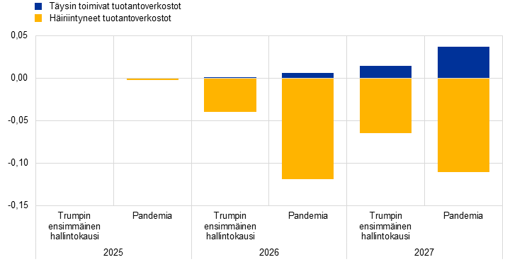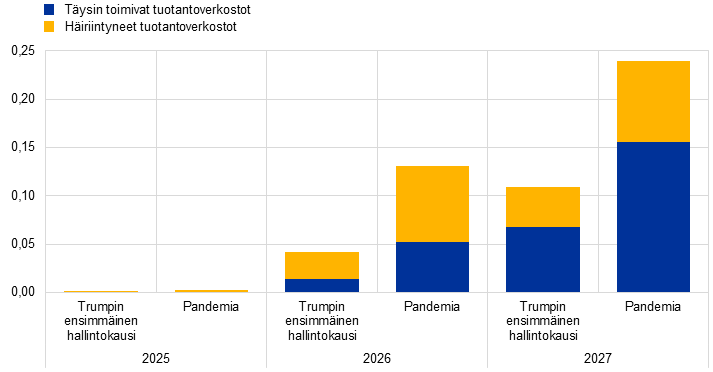 Ensimmäisessä vaihtoehtoisessa kehitysurassa vaikutukset euroalueen talouteen ovat minimaaliset. Toisessa ne ovat sen sijaan mittavammat, ja toimitusketjuihin kohdistuu vakavampia häiriöitä, kuten pandemia-aikana. Aluksi oletetaan talouden tuotantoverkostojen olevan täysin toimivat ja sovelletaan ECB BASE ‑mallia kehitysuraan, jossa esiintyy samankaltaisia tarjontakapeikkoja kuin Trumpin ensimmäisen hallinnon aikana. Tällöin esiintyisi vain minimaalisia inflaatiopaineita, ja YKHI-inflaatio olisi alle 0,1 prosenttiyksikköä nopeampi vuonna 2027 (ks. kuvion 20 kohta b, siniset palkit). Skenaario, jossa esiintyy samanlaisia sokkeja kuin pandemia-aikana, johtaisi selvempiin inflaatiovaikutuksiin. YKHI-inflaatio olisi jopa 0,15 prosenttiyksikköä nopeampi kuin vuonna 2027 (ks. kuvion 20 kohta b, siniset palkit). Molemmissa herkkyysanalyyseissa BKT:n vaikutus on vähäinen tai lievästi positiivinen, mikä johtuu muuttumattomien korkojen oletuksesta. Nopeamman inflaation yhteydessä se merkitsee reaalikorkojen laskua, joka nopeuttaisi talouden toimintaa (ks. kuvion 20 kohta a, siniset palkit). Seuraavaksi analyysia laajennetaan soveltamalla panos-tuotoskytkökset huomioivaa, useita maita ja toimialoja käsittävää mallia, jossa muiden alueiden tuotantoverkostojen toiminta on häiriintynyt ja toimitusketjuissa on esteitä. Tämä oletus vähentää korvattavuutta tuotantoketjujen sisällä ja aiheuttaisi selvempiä vaikutuksia (ks. kuvion 20 keltaiset palkit). Tässä tapauksessa inflaatio voisi olla vuonna 2027 perusskenaarioon nähden jopa 0,1 prosenttiyksikköä nopeampi Trumpin ensimmäisen hallinnon skenaariossa ja lähes 0,25 prosenttiyksikköä nopeampi vakavammassa pandemiaskenaariossa, ja BKT:n kasvu olisi hieman vaimeampaa.[19]