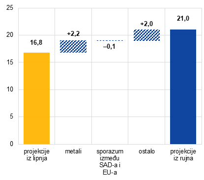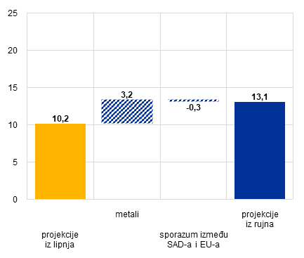 • Ukupna efektivna carinska stopa SAD‑a na uvoz robe svih trgovinskih partnera povećala se sa 16,8 %, koliko je predviđeno u projekcijama iz lipnja, na 21,0 % (Grafikon A, dio b)). To je posljedica udvostručenja univerzalnih carina na čelik i aluminij (s 25 % u projekcijama iz lipnja 2025. na 50 %), dodavanja 407 derivata čelika i aluminija na popis proizvoda koji podliježu carinama, novih univerzalnih carina na bakar (50 %), bilateralnih trgovinskih sporazuma sklopljenih s ključnim trgovinskim partnerima (npr. s Europskom unijom, Japanom, Korejom i Vijetnamom), viših recipročnih stopa koje su stupile na snagu 7. kolovoza za države s kojima nije postignut trgovinski sporazum (npr. Indiju i Švicarsku), povećanja carina na brazilski izvoz (na 50 %) i kanadski izvoz (povećanje carinske stope na 35 % za robu koja nije u skladu sa sporazumom između SAD‑a, Kanade i Meksika) i sekundarnih carina primjenjivih na Indiju (dodatnih 25 postotnih bodova) kako bi se sankcionirala indijska kupnja ruske nafte.