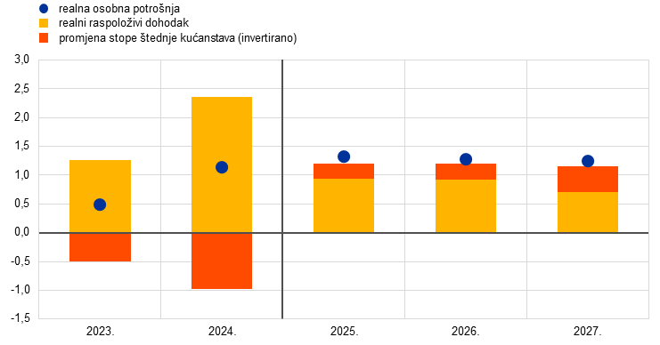8. Sve glavne kategorije potrošnje i dalje bilježe snažan rast, ali državna potrošnja donekle se usporava nakon visokih stopa rasta u 2024. Popuštanje nediskrecijskih činitelja u 2025. pretežno je posljedica manjka prihoda i drugih poreznih reziduala. Procjenjuje se da su kompozicijski učinci, koji su bili izrazito pozitivni u 2024. (porezne osnovice rasle su brže od nominalnog BDP‑a, što je dovelo do pooštravanja karaktera fiskalne politike), u 2025. i ostatku projekcijskog razdoblja uglavnom neutralni.