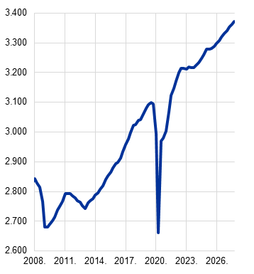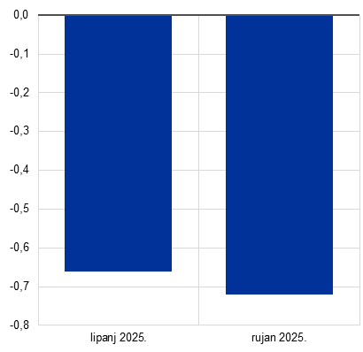 Inflacijski izgledi u skladu su sa stabiliziranjem inflacije na razinama oko srednjoročnog cilja od 2 %. Predviđa se da će ukupna inflacija mjerena harmoniziranim indeksom potrošačkih cijena (HIPC) uglavnom ostati nepromijenjena i iznositi oko 2 % u preostalom dijelu 2025. te da će se potom smanjiti na 1,7 % u 2026. i porasti na 1,9 % u 2027. Smanjenje u 2026. upućuje na daljnje postupno smanjenje komponenata inflacije bez energije. Inflacija cijena energije trebala bi pak i nadalje biti kolebljiva, ali porasti tijekom projekcijskog razdoblja, djelomično zbog uvođenja sustava EU‑a za trgovanje emisijama (ETS2) u 2027. Očekuje se da će inflacija cijena hrane u početku ostati povišena zbog prijenosa odgođenih učinaka prošlih povećanja međunarodnih cijena prehrambenih sirovina, ali da će se u 2026. i 2027. smanjiti na razine malo više od 2 %. Inflacija mjerena HIPC‑om bez energije i hrane trebala bi se smanjiti kako budu popuštali pritisci plaća i smanjivala se inflacija cijena usluga te kako se aprecijacija eura bude prenosila kroz cjenovni lanac i ograničavala inflaciju cijena dobara. Očekuje se da će manji rast plaća, kao posljedica nadoknađivanja prošlog pada realnih plaća, zajedno s oporavkom rasta produktivnosti znatno usporiti rast jediničnih troškova rada. U odnosu na projekcije iz lipnja 2025. izgledi za ukupnu inflaciju mjerenu HIPC‑om revidirani su naviše za 0,1 postotni bod za 2025. i 2026. zbog viših stvarnih i pretpostavljenih cijena energenata te zbog odgođenih učinaka viših međunarodnih cijena prehrambenih sirovina, koji više nego neutraliziraju aprecijaciju eura. Kada je riječ o 2027., predviđa se da će prevladavati odgođeni učinci aprecijacije eura, zbog čega je došlo do revizije naniže za 0,1 postotni bod.