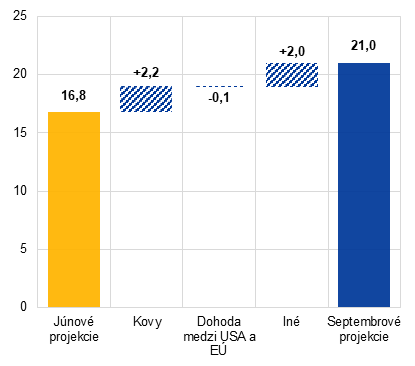 V dôsledku obchodnej dohody medzi USA a EÚ a iných oznámení sú efektívne colné sadzby na dovoz USA z eurozóny a všetkých jej obchodných partnerov v porovnaní s projekciami z júna 2025 vyššie. Projekcie odborníkov ECB zohľadňujú colné sadzby, odklady a výnimky platné v čase uzávierky projekcií (28. augusta) a predpokladajú, že zostanú na rovnakej úrovni počas celého sledovaného obdobia.