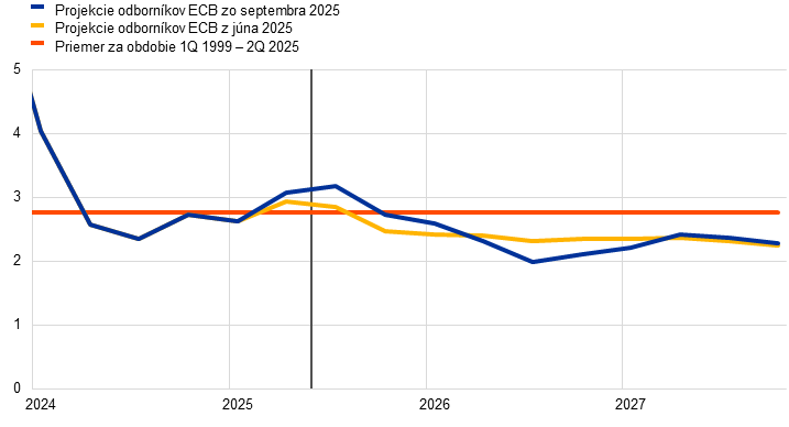 Projekcie odborníkov ECB | September 2025 | 1,2 | 1,0 | 1,3 | 2,1 | 1,7 | 1,9 | 2,4 | 1,9 | 1,8 |