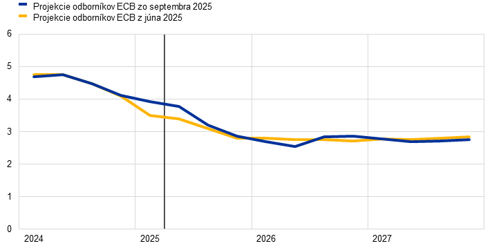 Výhľad inflácie je v súlade s jej stabilizáciou v blízkosti strednodobého cieľa na úrovni 2 %. Celková inflácia meraná harmonizovaným indexom spotrebiteľských cien (HICP) by sa mala počas zvyšku roka 2025 pohybovať stabilne okolo úrovne 2 %, v roku 2026 by mala klesnúť na 1,7 % a následne v roku 2027 vzrásť na 1,9 %. Pokles v roku 2026 odráža ďalšie postupné zmierňovanie neenergetických zložiek, pričom inflácia cien energií má zostať volatilná, ale v priebehu sledovaného obdobia má vzrásť, čiastočne v dôsledku zavedenia systému EÚ na obchodovanie s emisiami (ETS2) v roku 2027. Inflácia cien potravín by mala zostať spočiatku zvýšená, keďže sa do nej premietnu oneskorené účinky predchádzajúceho zvyšovania cien medzinárodných potravinových komodít, ale v rokoch 2026 a 2027 by sa mala mierne znížiť na úrovne mierne nad 2 %. Inflácia HICP bez energií a potravín (HICPX) má klesať vzhľadom na ústup mzdových tlakov a zmierňovanie inflácie cien služieb, ako aj zhodnocovanie eura, ktoré sa premietne do cenového reťazca a obmedzí infláciu cien tovarov. Nižší rast miezd po vyrovnaní predchádzajúcich strát reálnych príjmov v spojení s oživením rastu produktivity by mal viesť k výrazne pomalšiemu rastu jednotkových nákladov práce. V porovnaní s projekciami z júna 2025 bol výhľad celkovej inflácie HICP na roky 2025 a 2026 upravený o 0,1 percentuálneho bodu nahor v dôsledku vyššieho aktuálneho vývoja a predpokladov cien energetických komodít, ako aj oneskorených účinkov vyšších medzinárodných cien potravinových komodít, ktoré prevážili zhodnocovanie eura. V roku 2027 by mali prevládnuť oneskorené účinky zhodnocovania eura, čo vedie k revízii o 0,1 percentuálneho bodu nadol.