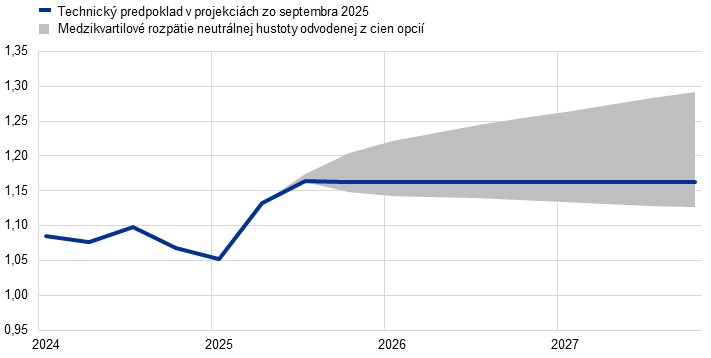 Táto analýza citlivosti posudzuje vplyvy alternatívneho vývoja výmenného kurzu, ktorý naznačuje možnosť ďalšieho tlaku na zhodnocovanie eura, a tým poukazuje na riziká pomalšieho hospodárskeho rastu a rastu inflácie. Technické predpoklady pre výmenné kurzy v základných projekciách sú počas sledovaného obdobia konštantné. Alternatívne scenáre oslabenia a posilnenia výmenného kurzu vychádzajú z 25. a 75. percentilu neutrálnych hustôt odvodených z cien opcií na výmenný kurz USD/EUR z 15. augusta 2025, pričom rozpätie bolo naklonené smerom k zhodnocovaniu eura (graf 16). Vplyv týchto alternatív sa hodnotí pomocou makroekonomických modelov odborníkov ECB a Eurosystému. Priemerný vplyv na rast produkcie a infláciu podľa týchto modelov je uvedený v tabuľke 7.