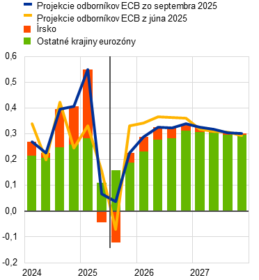 Obchodné clá a súvisiaca neistota prispeli v prvej polovici roka 2025 k výrazným výkyvom hospodárskej aktivity, s preventívnym nárastom aktivity, najmä v Írsku. Očakáva sa, že ustupovanie týchto faktorov v druhej polovici roka povedie k ďalšej volatilite, ktorá bude zahmlievať signály základnej dynamiky hospodárstva eurozóny. Odhliadnuc od volatility spôsobenej fluktuáciami írskych údajov bol hospodársky rast vo zvyšku eurozóny stabilnejší a očakáva sa, že taký zostane aj v druhej polovici roka. Hoci nová obchodná dohoda medzi USA a EÚ znamená vyššie clá na vývoz z eurozóny do Spojených štátov, pomohla zmierniť neistotu v oblasti obchodnej politiky. Neskôr počas sledovaného obdobia by sa mal hospodársky rast v eurozóne zrýchľovať s prispením niekoľkých faktorov. Rast reálnych miezd a zamestnanosti spolu s novými vládnymi výdavkami na infraštruktúru a obranu, najmä v Nemecku, by mal posilniť domáci dopyt v eurozóne. Výhľad rastu by mali podporiť aj menej reštriktívne podmienky financovania – najmä v dôsledku nedávnych menovopolitických rozhodnutí – a oživenie zahraničného dopytu v roku 2027. Ročný priemerný rast reálneho HDP má podľa projekcií dosiahnuť 1,2 % v roku 2025, 1,0 % v roku 2026 a 1,3 % v roku 2027. V porovnaní s makroekonomickými projekciami odborníkov Eurosystému z júna 2025 bol výhľad rastu HDP na rok 2025 upravený o 0,3 percentuálneho bodu nahor vzhľadom na lepšie než očakávané aktuálne údaje a prenosový efekt revízií historických údajov. Keďže nie všetky nečakané údaje súvisia s výraznejším preventívnym nárastom hospodárskej aktivity, než sa pôvodne predpokladalo, v druhej polovici roka sa očakáva len ich čiastočná kompenzácia. Zhodnotenie eura a slabší zahraničný dopyt (čiastočne v súvislosti s mierne vyššími clami, než sa predpokladalo v júnových projekciách) viedli k revízii o 0,1 percentuálneho bodu smerom nadol na rok 2026. Projekcia na rok 2027 zostáva nezmenená.[1]