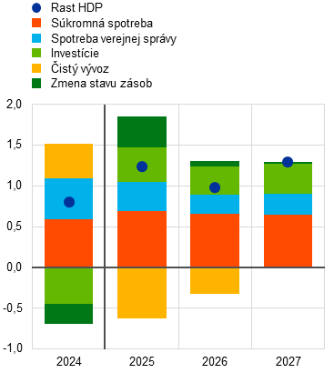Hybnou silou rastu reálneho HDP by mala byť aj naďalej súkromná spotreba. Z hľadiska výdavkov (graf 2, panel a) sa počas sledovaného obdobia predpokladá výrazný rast súkromnej spotreby, ktorá by mala k rastu reálneho HDP prispieť najviac. Okrem toho by sa v rokoch 2025 až 2027 mala každoročne zvyšovať spotreba verejnej správy a celkové investície, pričom súkromné investície by mali kompenzovať očakávaný silný skokový efekt vo verejných investíciách v roku 2027 v dôsledku ukončenia financovania z grantov NGEU. Naopak, príspevok čistého vývozu k rastu reálneho HDP by mal byť v rokoch 2025 a 2026 záporný, pričom príspevok dovozu (-1,2 percentuálneho bodu a -0,9 percentuálneho bodu) má prevýšiť príspevok vývozu (0,6 percentuálneho bodu, resp. 0,5 percentuálneho bodu). Tento vplyv je však čiastočne vykompenzovaný kladným príspevkom zmien zásob v roku 2025 (graf 2, panel b). Vysoko volatilné zmeny zásob v priebehu roka 2025 súvisia s hromadením a znižovaním zásob v kontexte účinkov predzásobovania a ich ústupu.
