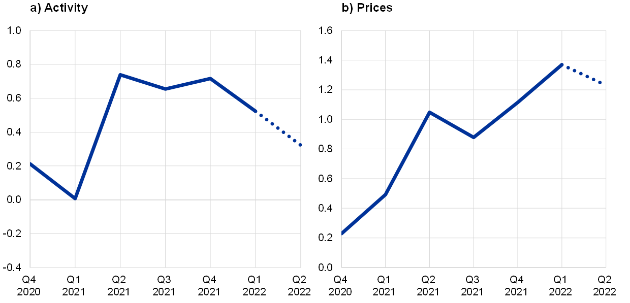 The Russian invasion of Ukraine has clouded the outlook and created substantial downside risks. Many contacts described an abrupt change in business conditions after the conflict flared up in late-February, albeit largely in terms of prices and costs rather than activity. The direct financial impact was small, while the immediate impact on production (and intermediate demand) was largely limited to specific industries dependent on materials or components from Russia or Ukraine, or for which rising energy costs made some production unviable. This created a new source of (potential) supply disruption, along with the spread of the Omicron variant through China and public health measures taken in response. A few contacts pointed to broader changes in behaviour, such as households shifting their consumption to less expensive items, reduced vehicle use or businesses postponing advertising orders, as early evidence of more widespread demand effects. Most contacts expected rising inflation to dampen consumer spending and both uncertainty and rising costs to have an impact on business investment in the coming quarters. This was, however, tempered by a view that, in an environment still characterised by supply constraints, the effect of reduced demand on production would be gradual. Furthermore, receding concern surrounding the pandemic would continue to support growth in the services sector. Overall, therefore, contacts tended to anticipate a slowdown rather than a sudden contraction in activity, while at the same time stressing huge uncertainty and substantial downside risks if the conflict were to escalate.