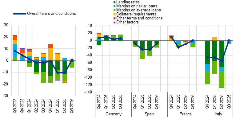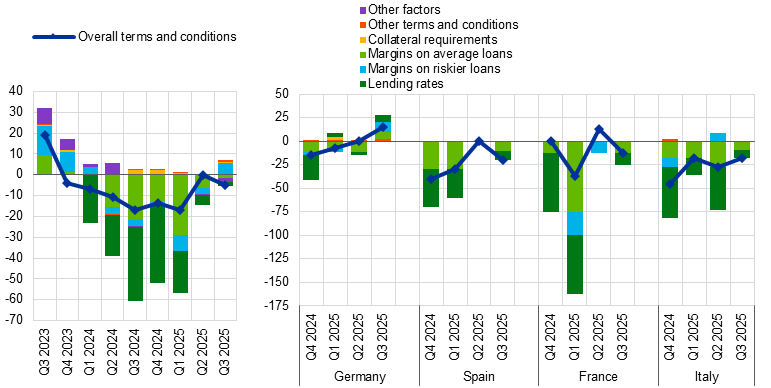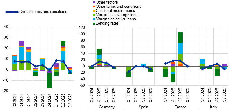 In the October 2025 bank lending survey (BLS), euro area banks reported a small unexpected net tightening of credit standards for loans or credit lines to firms in the third quarter of 2025 (net percentage of banks of 4%; see Overview table).[1] Perceived risks to the industry or firm-specific situation and perceived risks to the economic outlook contributed to tighter credit standards, with the current high level of geopolitical uncertainty and risks connected to trade cited as reasons for discriminating across sectors or firms when issuing new loans. Several banks indicated more intensive monitoring and analysis. Across the four largest euro area countries, banks in Germany reported a tightening of credit standards while banks in France, Italy and Spain reported unchanged credit standards. The net tightening was unexpected as, in the previous round, banks had anticipated that credit standards would remain unchanged (0%) and it follows broadly unchanged credit standards in the second quarter (-1%). For the fourth quarter of 2025, banks expect broadly unchanged credit standards for firms (1%).