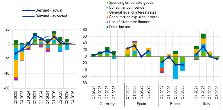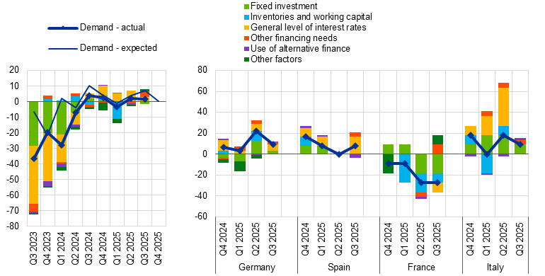 Firms’ demand for loans increased slightly in the third quarter of 2025 (net percentage of 2%) but remained weak overall. This followed a small increase in loan demand in the previous quarter (2%). Firms’ loan demand was supported in the third quarter by declining lending rates and by increased financing needs for debt refinancing or debt restructuring, while the impact of fixed investment, inventories and working capital was neutral. Several banks referred to a dampening impact on loan demand from global uncertainty and the related trade tensions. Across the four largest euro area countries, banks in Germany, Italy and Spain reported a net increase in firms’ loan demand, whereas banks in France reported another marked net decrease. The increase in loan demand was weaker than expected (7%). For the fourth quarter of 2025, banks expect unchanged loan demand from firms (0%).