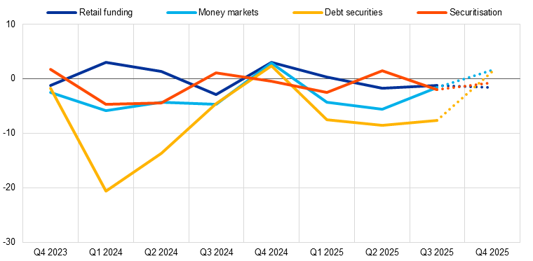 • Banks’ access to retail funding remained broadly unchanged in the third quarter of 2025, eased slightly for money markets and securitisations, and to a greater extent for debt securities. Access to debt securities eased more strongly for medium to long-term securities. Over the next three months, banks expect access to improve slightly for retail funding and to tighten slightly for money markets, while remaining broadly unchanged for debt securities and securitisation.