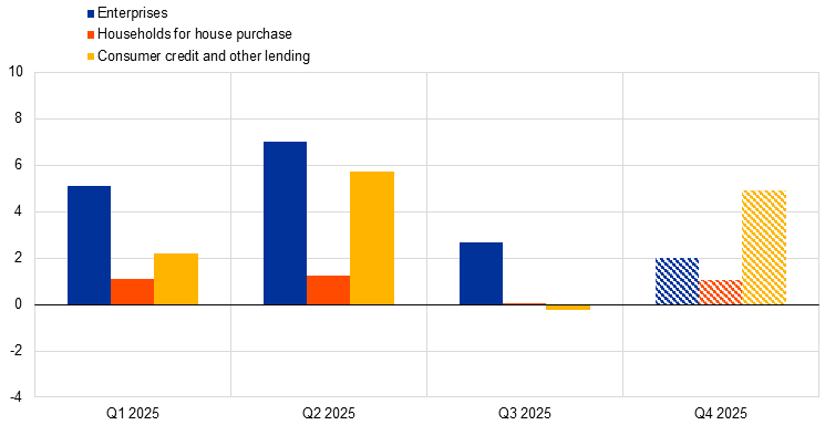In the fourth quarter of 2025, euro area banks expect a somewhat more noticeable tightening impact of credit quality on their lending conditions for consumer credit and loans to firms, mostly related to supervisory or regulatory requirements. Both credit standards and terms and conditions are expected to be affected, for loans to firms and for loans to households for consumer credit, while no change is expected for loans to households for house purchase. Banks expect higher pressure from supervisory or regulatory requirements to drive this tightening in the next quarter, whereas they reported lower expected costs related to the capital position.