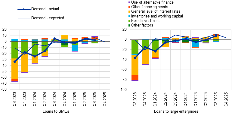 In the fourth quarter of 2025, euro area banks expect broadly unchanged credit standards for loans to firms (net percentage of 1%). Banks expect a small tightening of credit standards for loans to SMEs and large firms (4% and 3% respectively), with broadly unchanged credit standards for short-term loans (1%) and a small tightening for long-term loans (4%).