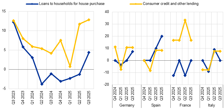 Banks reported a further net increase in demand for housing loans, while demand for consumer credit was broadly unchanged (net percentages of 28% and 1% respectively). Improved housing market prospects and declining lending rates were the primary drivers of the sustained increase in housing loan demand. The net increase was observed across a wide range of euro area countries. It was lower than in the previous quarter (37%) but higher than banks’ expectations (21%). Consumer credit demand was supported by declining interest rates and “other factors”, but this was offset by lower consumer confidence. The developments in demand for consumer credit were in line with banks’ expectations (1%). For the fourth quarter of 2025, banks expect demand for housing loans to expand further (8%), albeit at a more moderate pace than in previous quarters, while a small increase is expected for consumer credit (2%).