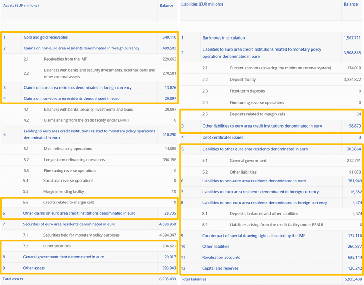 Ar an tsócmhainn agus ar thaobh dliteanais chlár comhardaithe bainc ceannais, tá suíomhanna ann nach mbaineann go díreach le beartas airgeadaíochta. Sainmhínítear an difríocht idir an dá shraith suíomhanna mar ghlansócmhainní airgeadais nó NFA. Léirítear an coincheap seo thíos, ag baint úsáide as clár comhardaithe ráiteas airgeadais seachtainiúil an Eurochórais amhail ón 29 Nollaig 2023, mar a foilsíodh ar shuíomh gréasáin BCE. Tugtar sainmhíniú beacht in Iarscríbhinn I de ANFA.