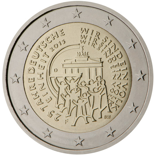 Description: The people in the foreground, who embody a new beginning and the advance towards a better future, are standing in front of the Brandenburg Gate, symbol of German unity. The rendering of the statement Wir sind ein Volk (‘we are one people’) — a collective expression of will by German citizens – represents the path forwards towards German reunification. The inner part also features the mint mark of the respective mint (‘A’, ‘D’, ‘F’, ‘G’ or ‘J’) as well as the issuing country’s country code ‘D’ and the engraver’s mark (the initials ‘BW’ — Bernd Wendhut). The coin’s outer ring bears the 12 stars of the European Union.