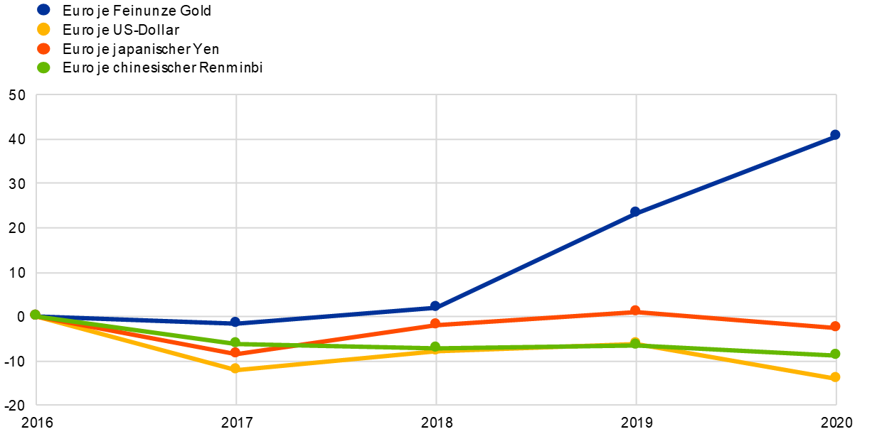 Der Euro-Gegenwert der Bestände der EZB an Gold und Goldforderungen nahm 2020 um 3,1 Mrd € zu und lag bei 25,1 Mrd € (siehe Abbildung 4), was einem Anstieg des Goldpreises in Euro zuzuschreiben war. Derweil blieb der Goldbestand in Feinunzen unverändert. Diese Zunahme führte auch zu einem entsprechenden Anstieg des Ausgleichspostens aus Neubewertung für Gold der EZB (siehe Abschnitt 1.3.2 „Finanzielle Mittel“).