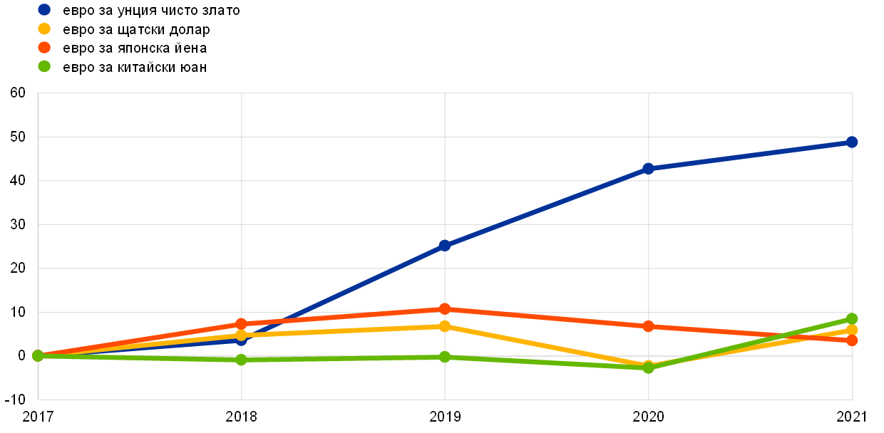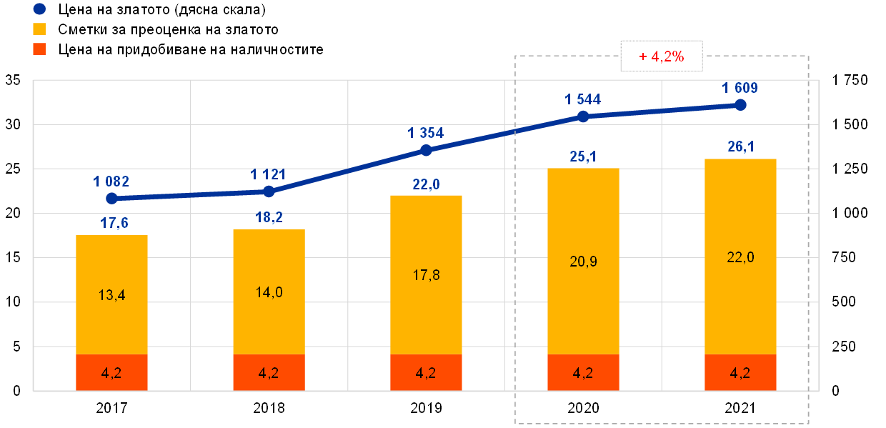 Равностойността в евро на наличностите на ЕЦБ от злато и вземания в злато се увеличи през 2021 г. с 1,1 млрд. евро до 26,1 млрд. евро (Графика 4) поради нарастване на пазарната цена на златото в евро, като размерът на наличностите в унции чисто злато остана непроменен. Това нарастване доведе и до увеличение в същия размер в сметките на ЕЦБ за преоценка на златото (вижте раздел 1.3.2 „Финансови ресурси“).