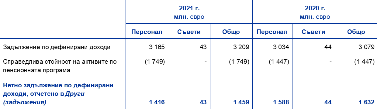 - Стълбът на дефинирани доходи в пенсионната програма отразява само задължителните вноски от ЕЦБ и служителите. Доброволните вноски на служителите в стълба на дефинирани вноски са в размер на 220 млн. евро през 2021 г. (спрямо 186 млн. евро през 2020 г.). Тези вноски са инвестирани в активите по пенсионната програма и пораждат съответстващо задължение на същата стойност.