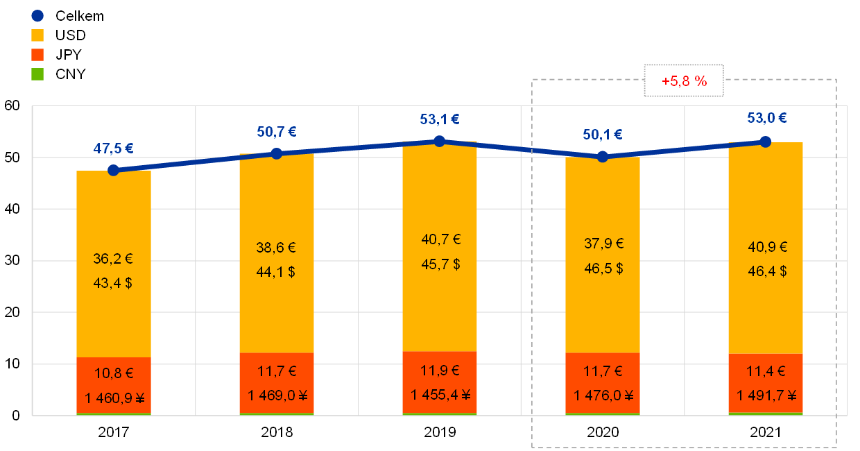 Americký dolar byl nadále hlavní složkou devizových rezerv ECB a na konci roku 2021 představoval zhruba 77 % jejich celkového objemu.