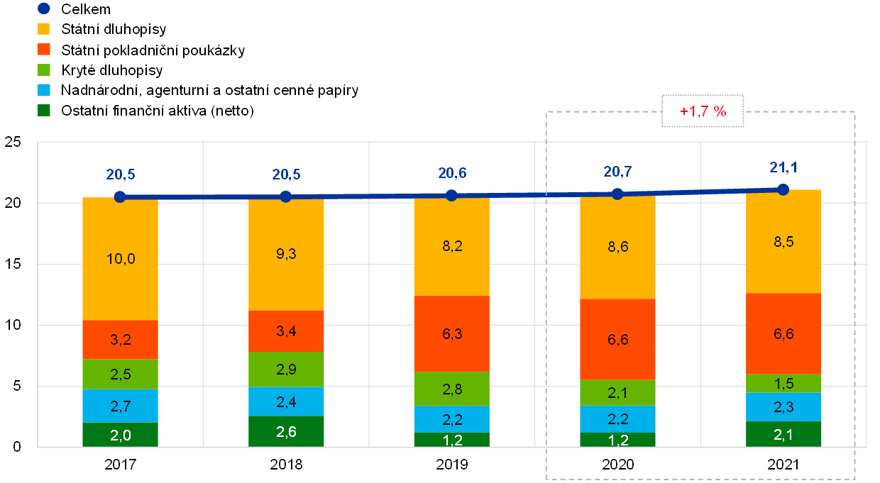Vývoj rozvahy ECB v období let 2017 až 2021 vyplýval především z jejích přímých nákupů cenných papírů v rámci implementace měnové politiky Eurosystému (graf 1). Rozvaha ECB se v roce 2018 zvětšila především v důsledku čistého pořízení cenných papírů v rámci programu nákupu aktiv (APP)[6]. Čisté nákupy v rámci tohoto programu byly ukončeny v prosinci 2018 a opět obnoveny v listopadu 2019. Růst rozvahy ECB tak v roce 2019 zpomalil a vyplýval především ze zvýšení tržní hodnoty devizových rezerv ECB a růstu hodnoty eurobankovek v oběhu. V roce 2020 za účelem řešení dopadu pandemie koronaviru (COVID-19) Rada guvernérů rozhodla o komplexním souboru měnověpolitických opatření včetně zahájení nouzového pandemického programu nákupu aktiv (PEPP)[7], což vedlo k dalšímu růstu rozvahy. V roce 2021 probíhaly čisté nákupy v rámci APP a PEPP i nadále, čímž došlo k ještě dalšímu navýšení velikosti rozvahy ECB.