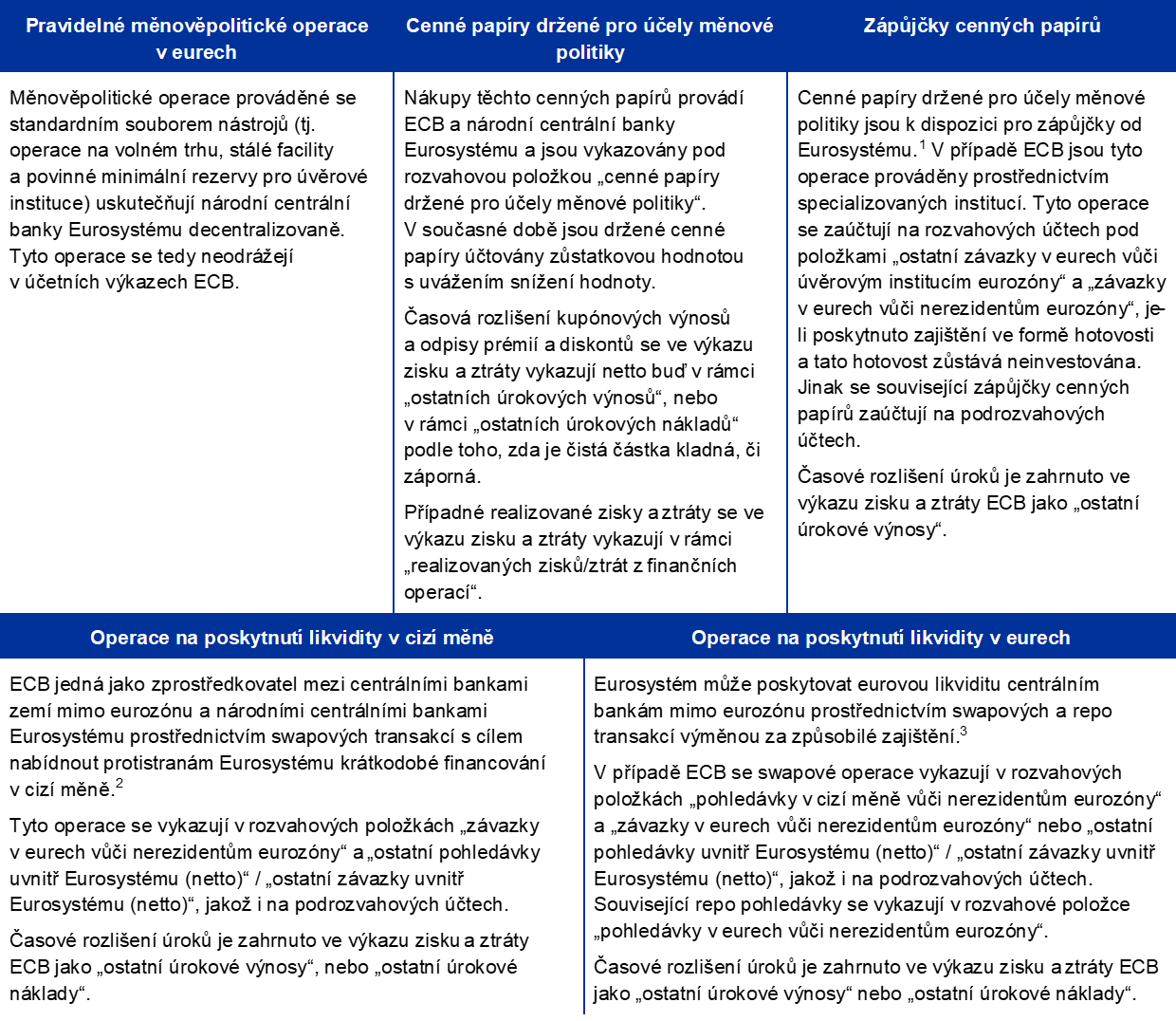 Operace měnové politiky Eurosystému se zachycují do účetních výkazů ECB a národních centrálních bank zemí eurozóny a odrážejí tak zásadu decentralizovaného provádění měnové politiky v Eurosystému. Tabulka 1 obsahuje přehled hlavních operací a funkcí ECB při plnění jejího mandátu a jejich dopad na účetní výkazy ECB.