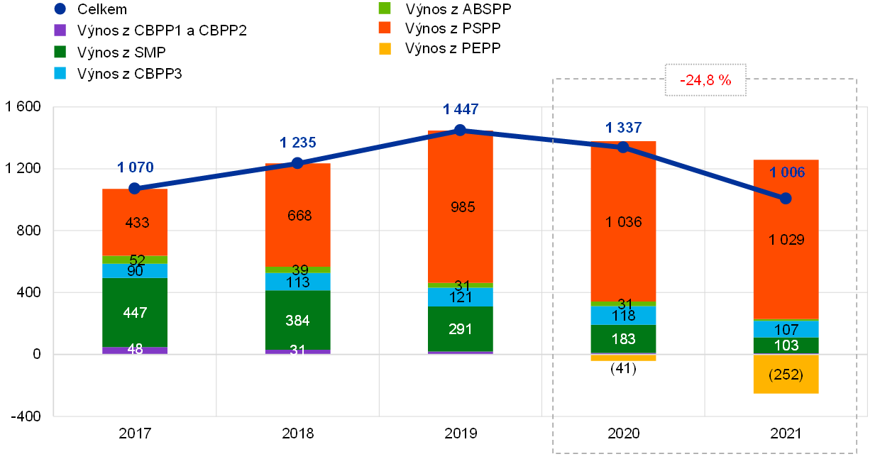 V roce 2021 představovaly cenné papíry držené pro účely měnové politiky 64 % čistého úrokového výnosu ECB.