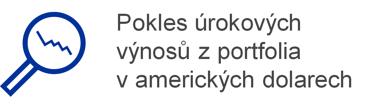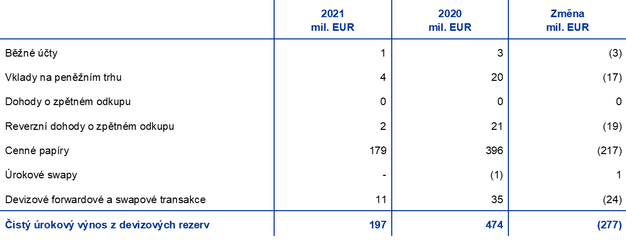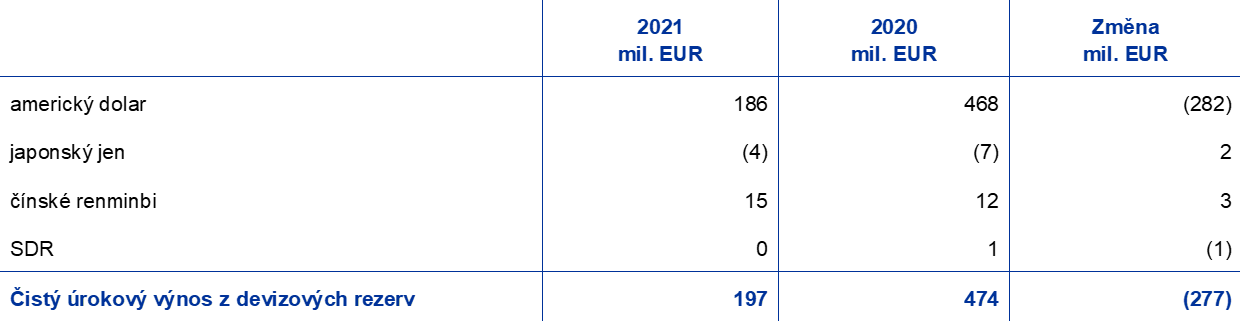Čistý úrokový výnos z devizových rezerv poklesl o 277 mil. EUR na 197 mil. EUR především v důsledku nižšího úrokového výnosu z cenných papírů v amerických dolarech. V důsledku nízkých výnosů z dluhopisů v amerických dolarech po většinu roku 2020 a 2021 (graf 17), prodejů a splacení dříve nakoupených dluhopisů s vyššími výnosy zaznamenala v roce 2021 průměrná úroková sazba z portfolia ECB v amerických dolarech oproti předchozímu roku další pokles.