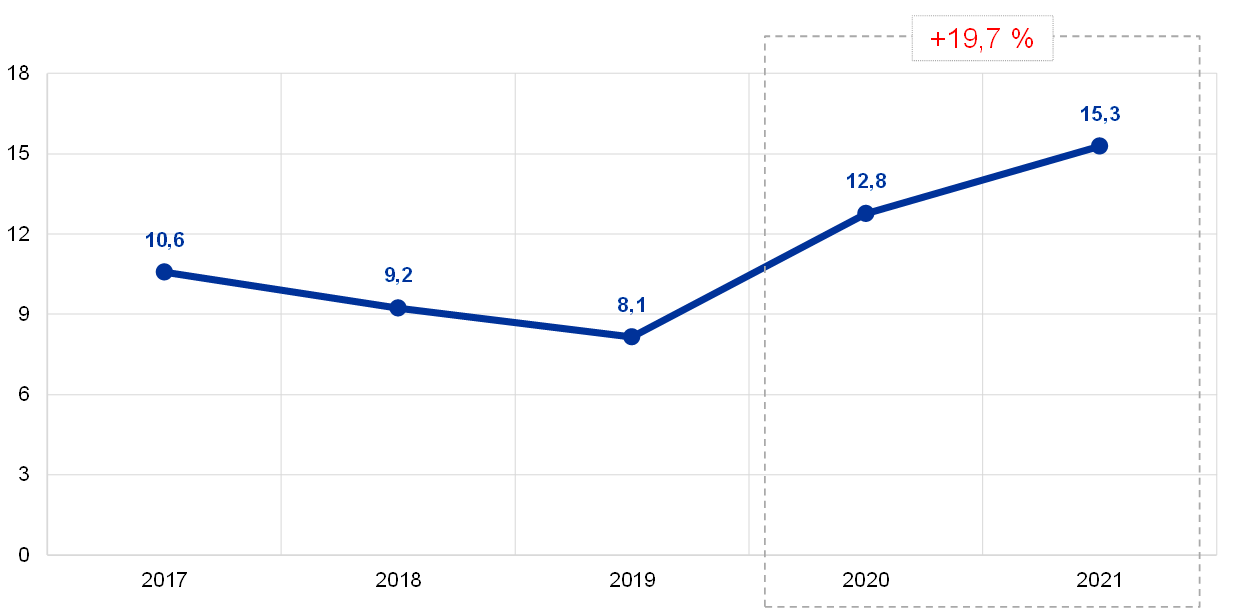 Oproti konci roku 2020 vzrostla na konci roku 2021 celková hodnota eurobankovek v oběhu o 8 % na 1 544,4 mld. EUR. ECB je z celkové hodnoty eurobankovek v oběhu přidělen 8% podíl, který na konci roku činil 123,6 mld. EUR. Vzhledem k tomu, že ECB sama bankovky nevydává, drží pohledávky uvnitř Eurosystému vůči národním centrálním bankám eurozóny v hodnotě rovnající se hodnotě bankovek v oběhu.