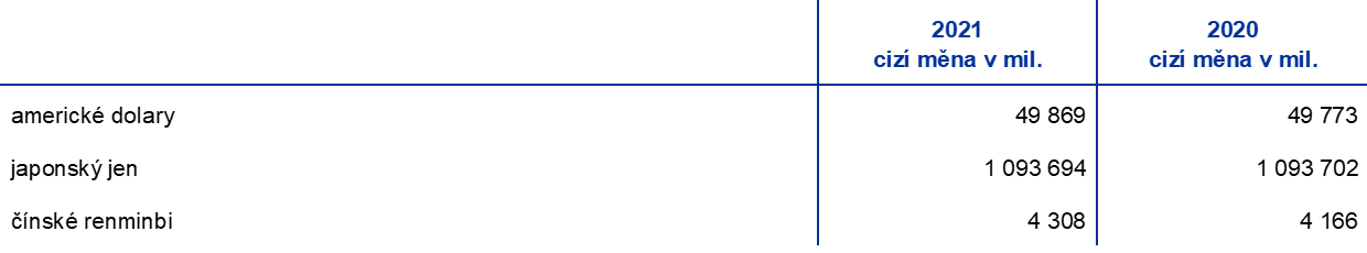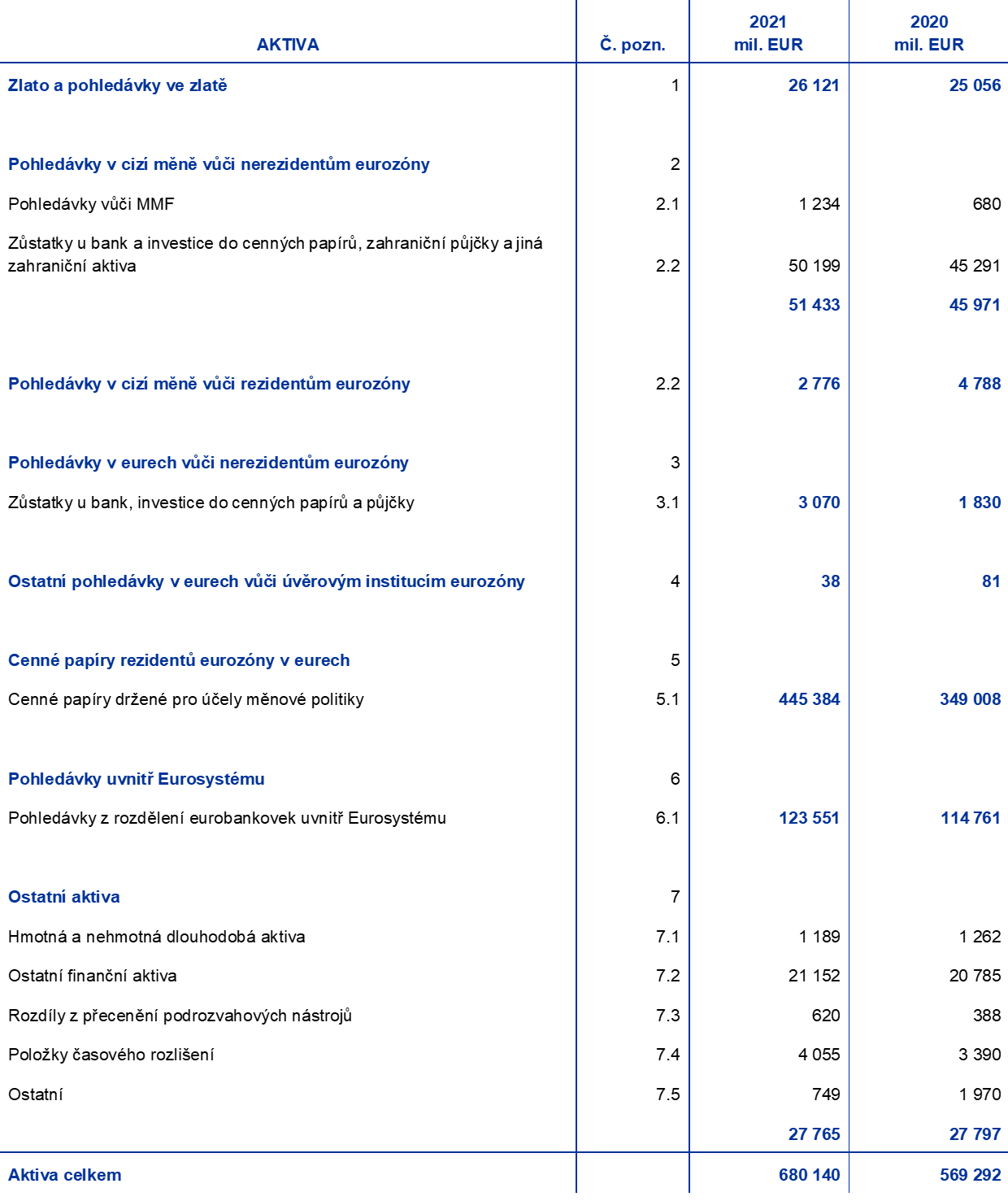 - Tato aktiva jsou zahrnuta pod rozvahovými položkami „pohledávky v cizí měně za nerezidenty eurozóny – zůstatky u bank a investice do cenných papírů, zahraniční půjčky a jiná zahraniční aktiva“ a „pohledávky v cizí měně za rezidenty eurozóny“.