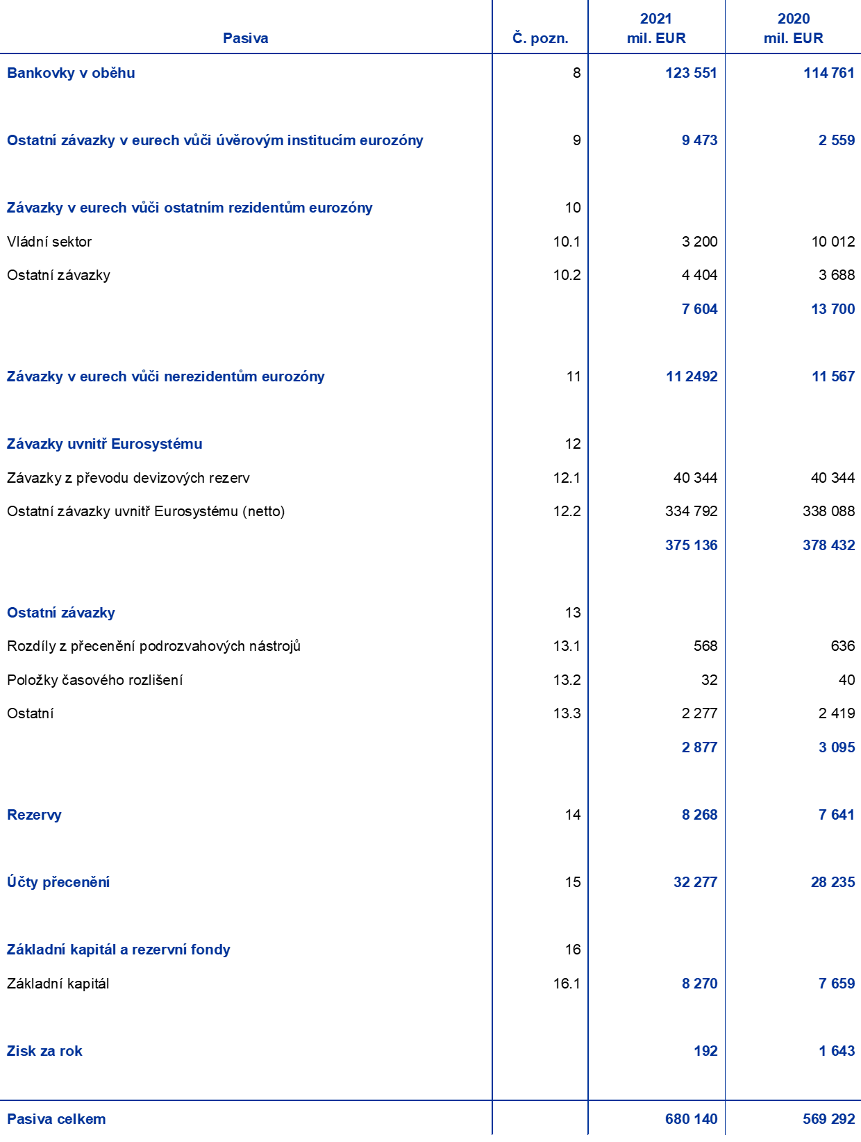 Poznámka: Položka „účty přecenění“ zahrnuje celkové zisky z přecenění zlata, deviz a cenných papírů, ale s vyloučením účtu přecenění týkajícího se požitků po skončení pracovního poměru.